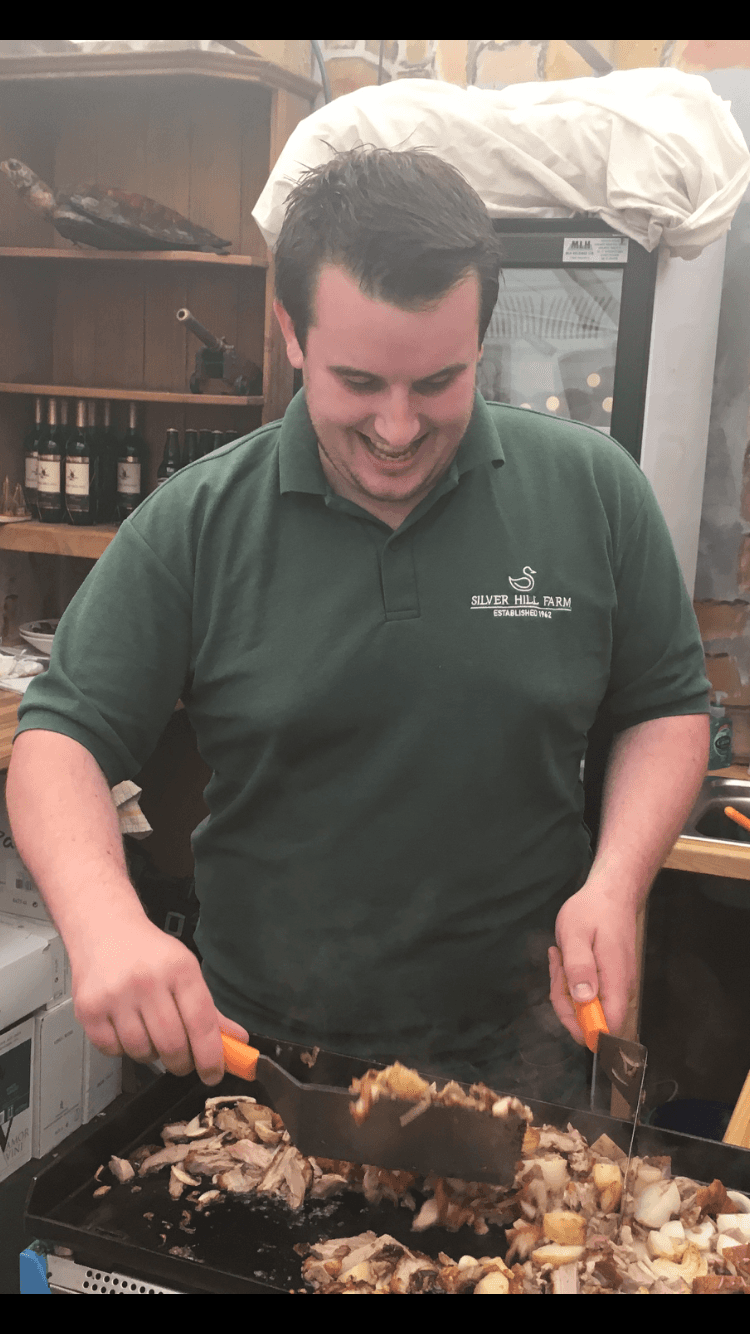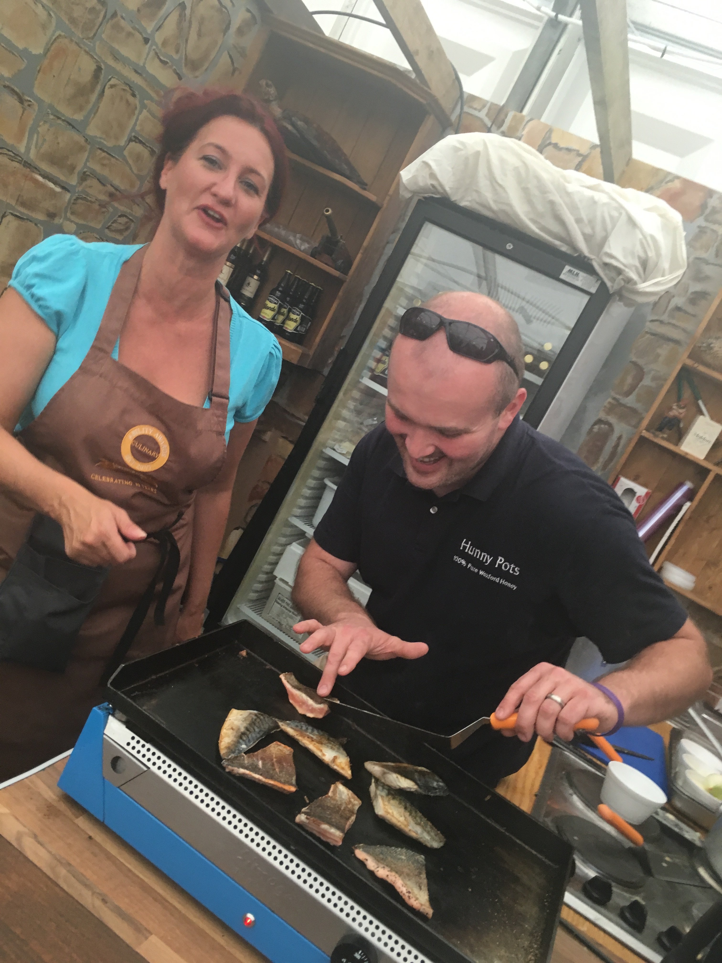 Dieses Mal waren wir die Organisatoren, d. h. organisiert wurde so gut wie nichts. Mark vom Smugglers Creek gab uns seinen Stand, das war klar, seine Fischlieferanten vom Restaurant spontan den Fisch, Jenny Eustace von Silverhill Duck noch spontaner Entenbrüste und Confit, Donegal Rapeseed Oil das Öl, und alle Stände drumrum superspontan, was sie so auf ihren Ständen hatten. Auf der Plancha lässt sich ja alles verwerten, wobei Chris am Sonntag auf der Bühne dann den Vogel im wahrsten Sinne abgeschossen hat: Mit Kaffee! Es soll sehr gut geschmeckt haben, so die Gäste, die das Los zogen, am „Chef’s table“ zu sitzen. Aus Höflichkeit gesagt? Glaube ich nicht – die Teller waren leer.